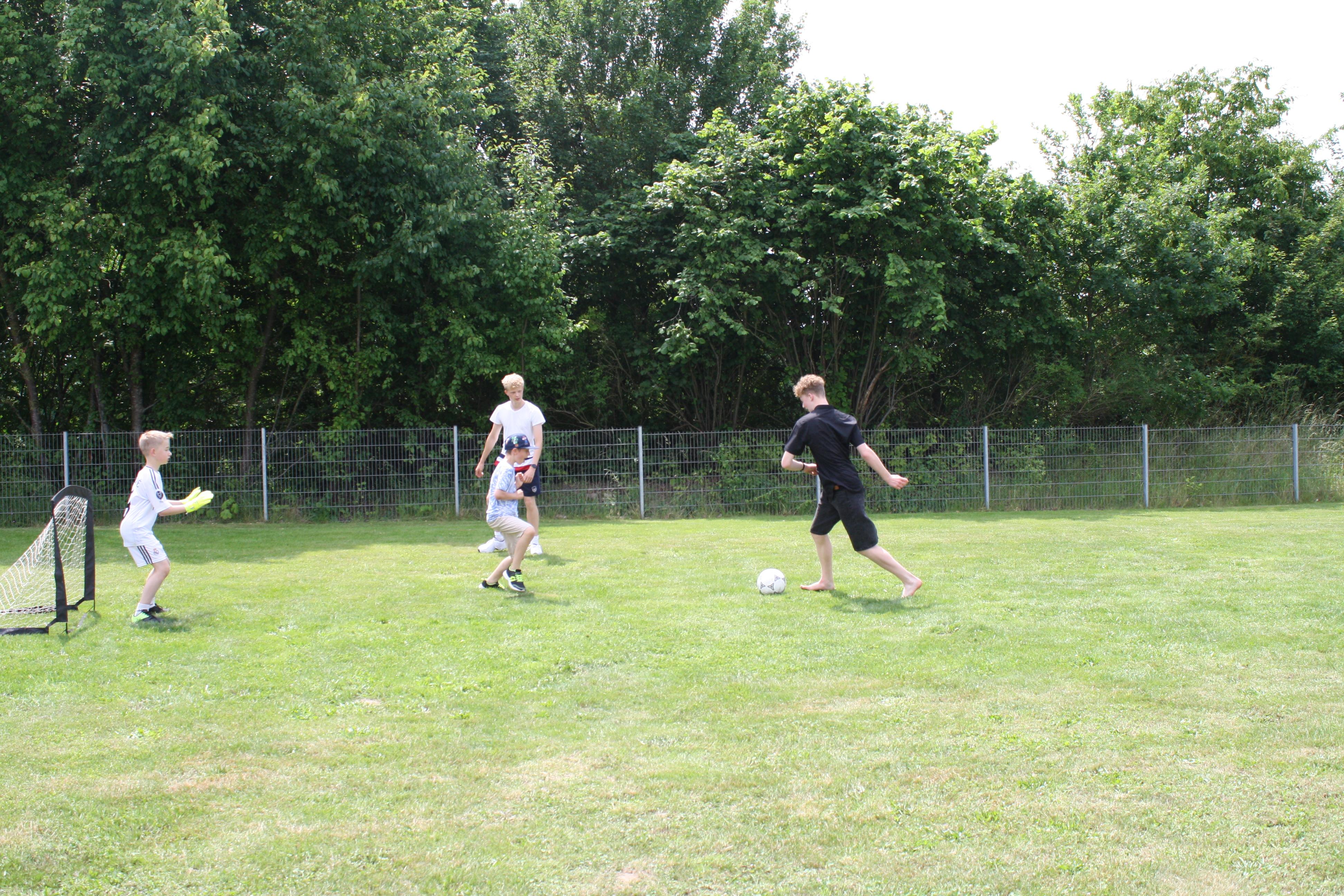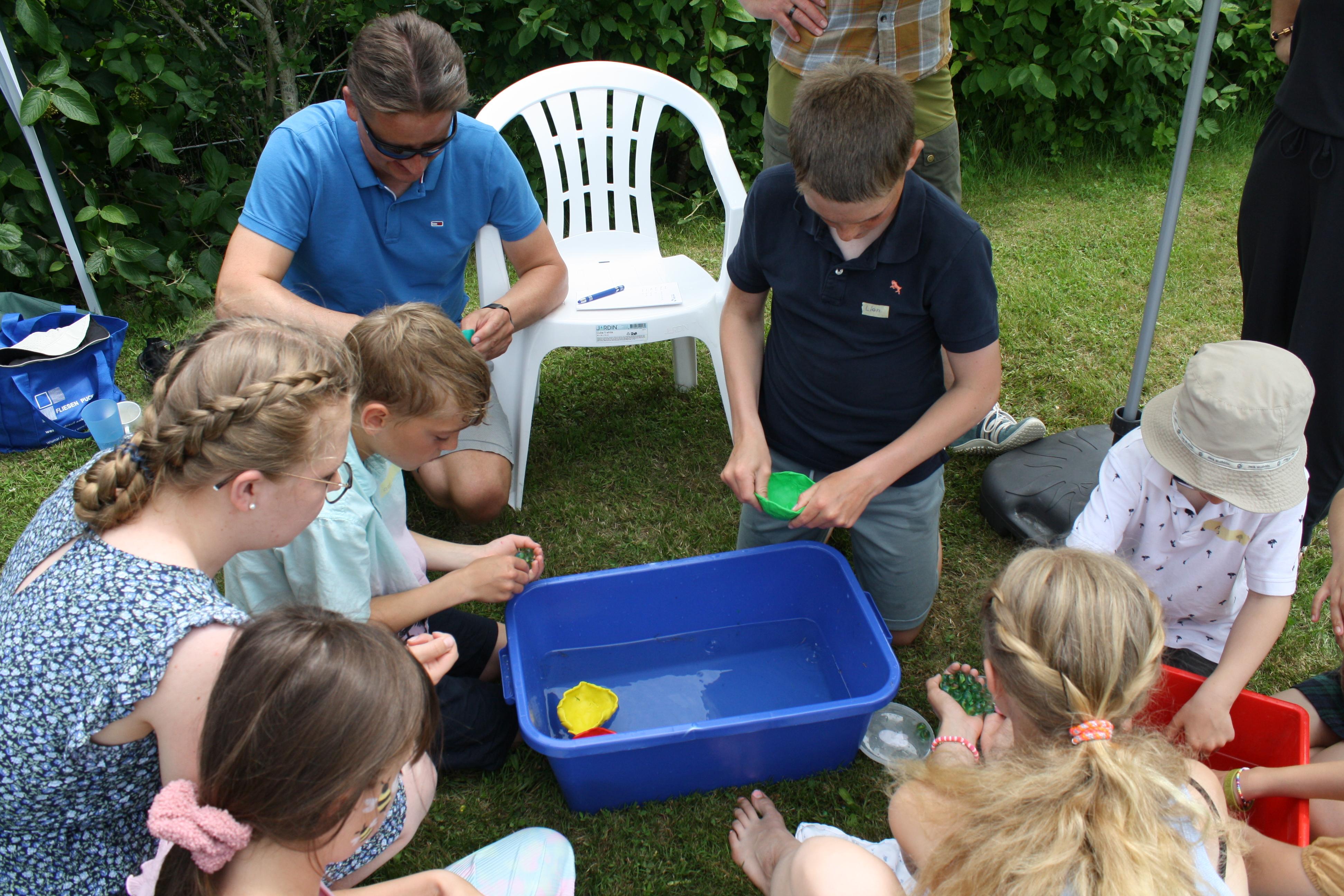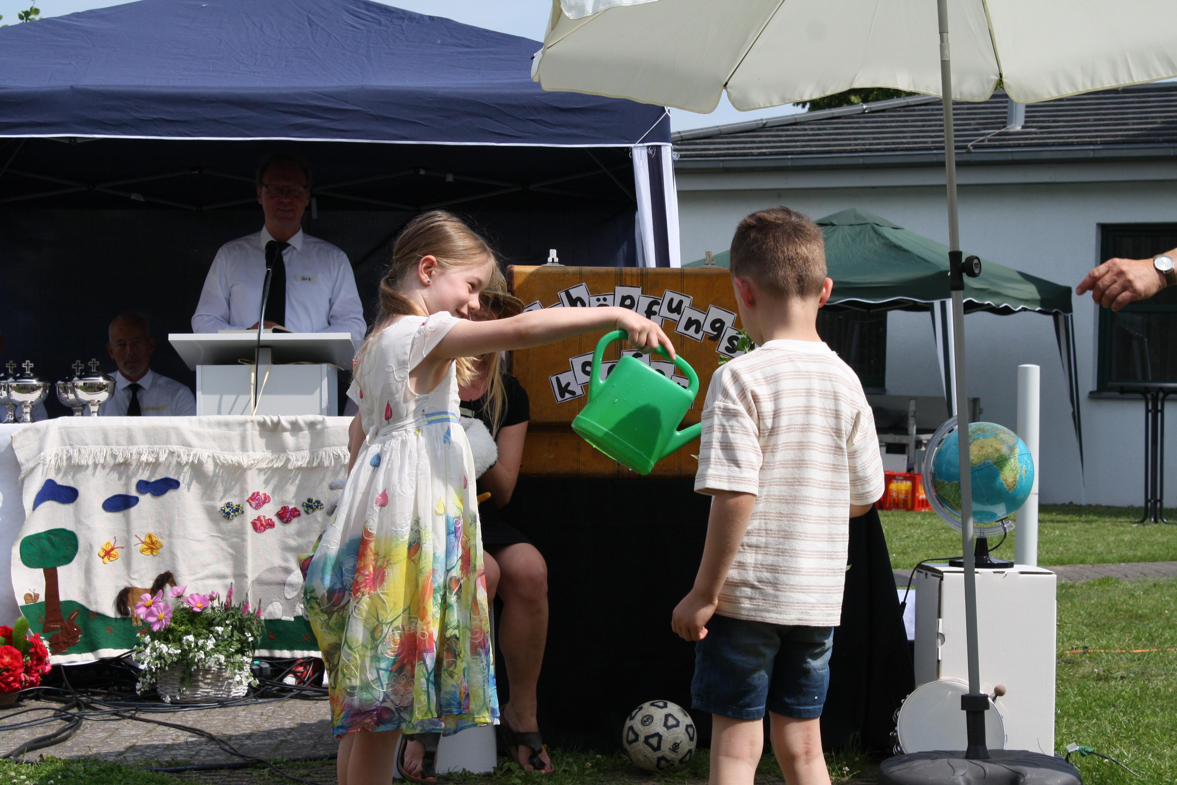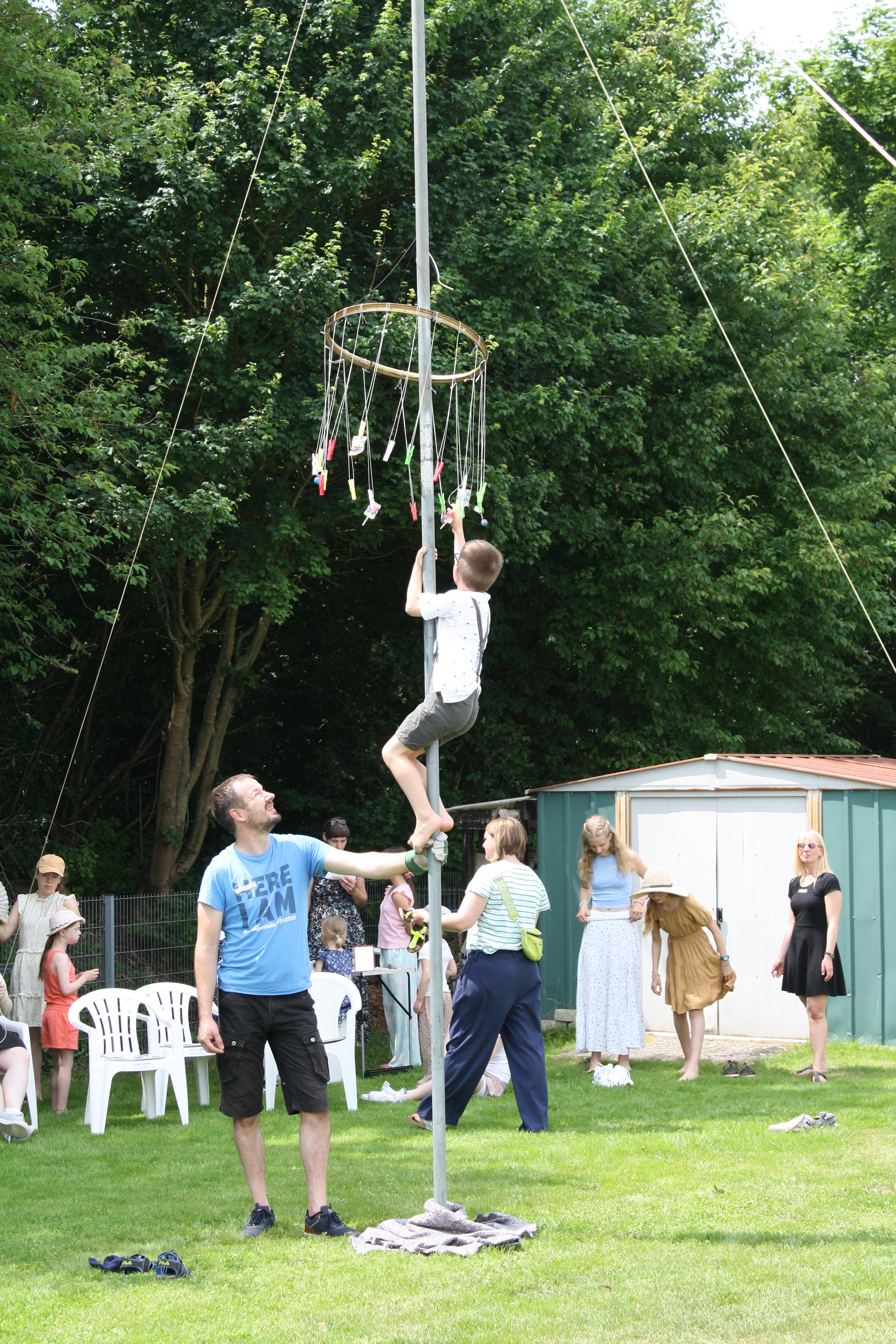 Nach dem Gottesdienst gab es zur Stärkung Hotdogs zum Mittagessen. Anschließend konnten sich die Kinder an vielen verschiedenen Mitmachstationen austoben und kreativ sein. Egal ob beim Stangenklettern, Fußball spielen, basteln eines Naturwebrahmen, Töpfe bepflanzen, Steine dekorieren, Erbsen schätzen, Kinderschminken und Seifenblasen machen. Und ein spannendes Murmel-Experiment: Ein Knetboot sollte mit so vielen Murmeln wie möglich beladen werden, ohne unterzugehen.