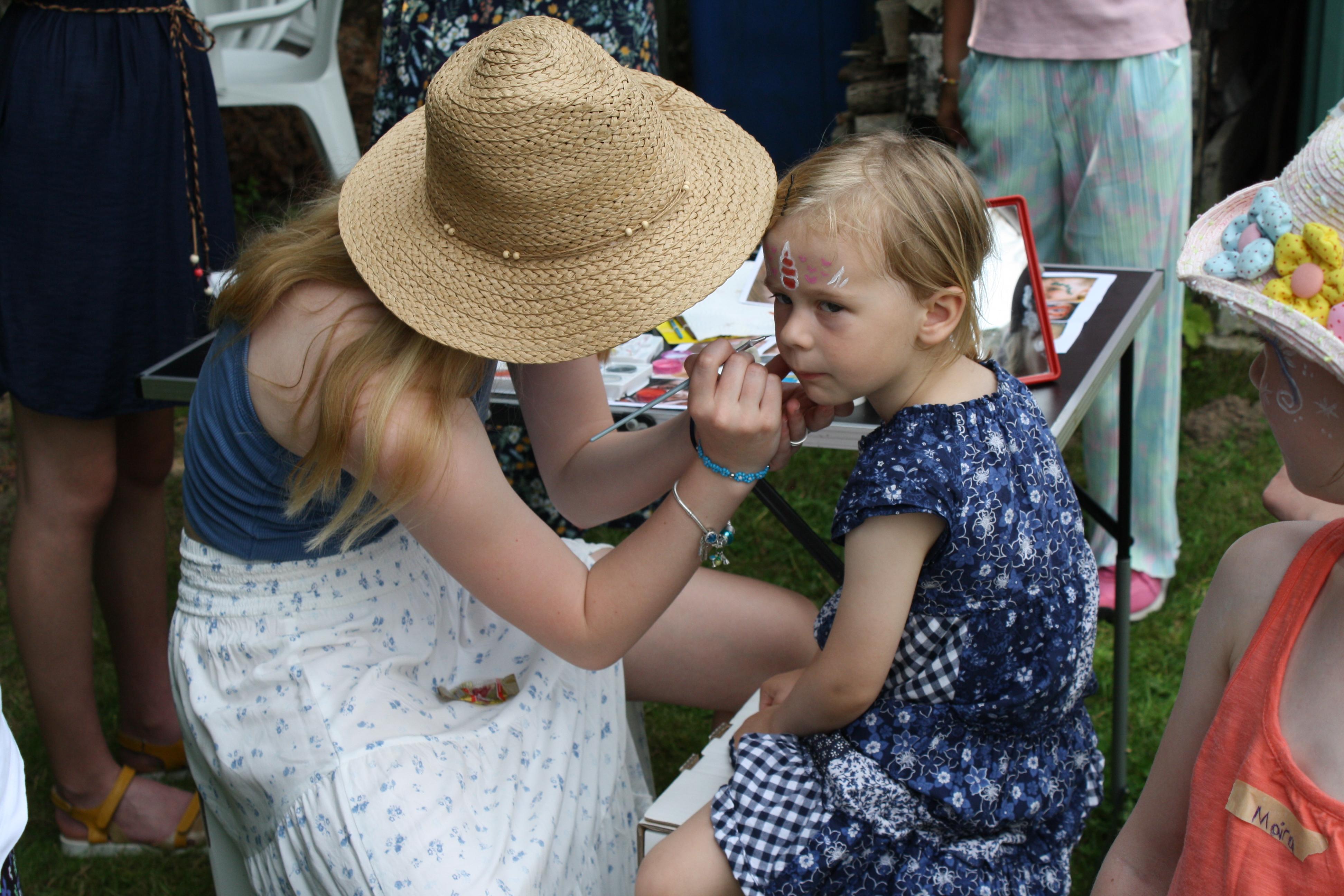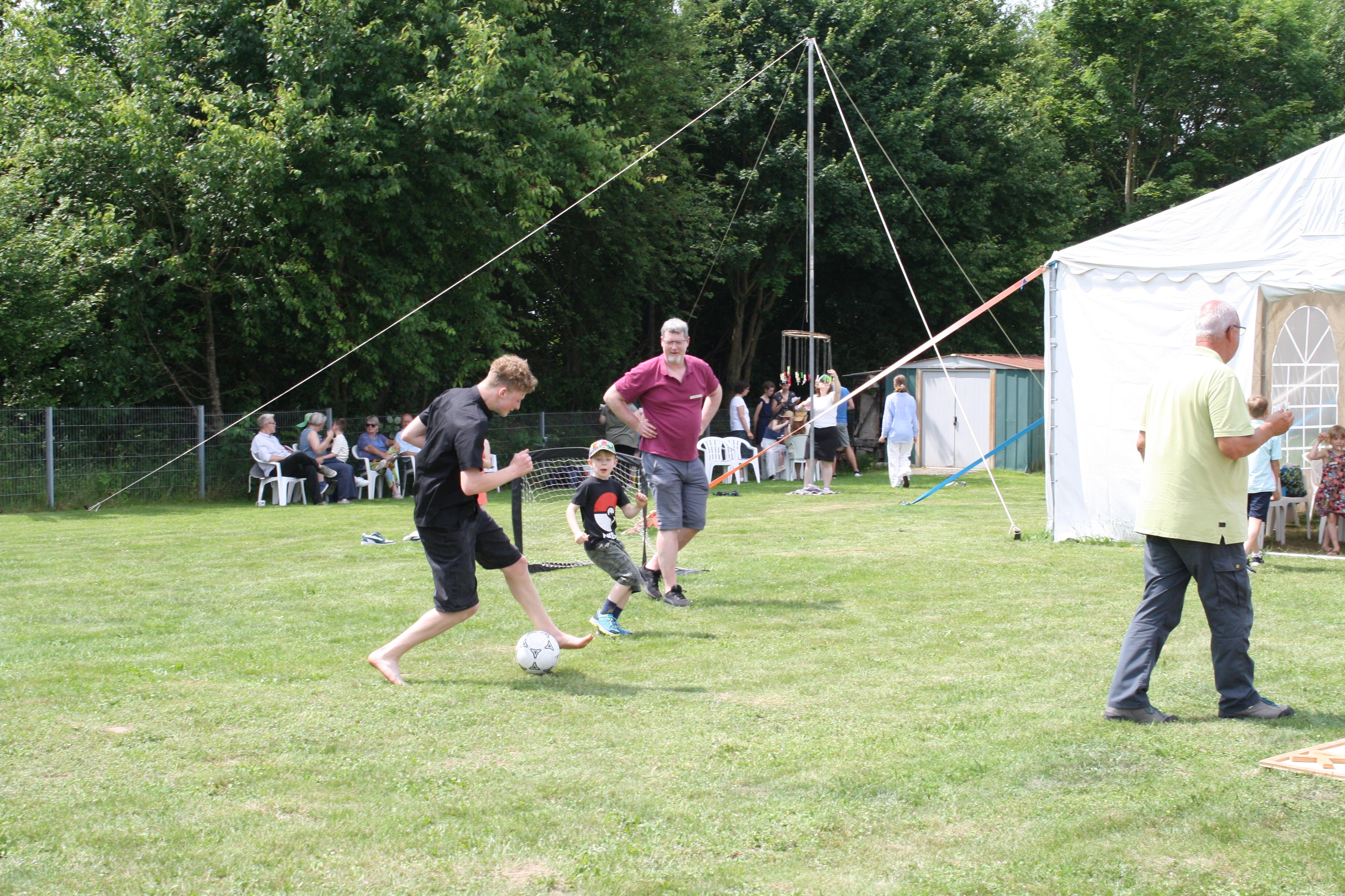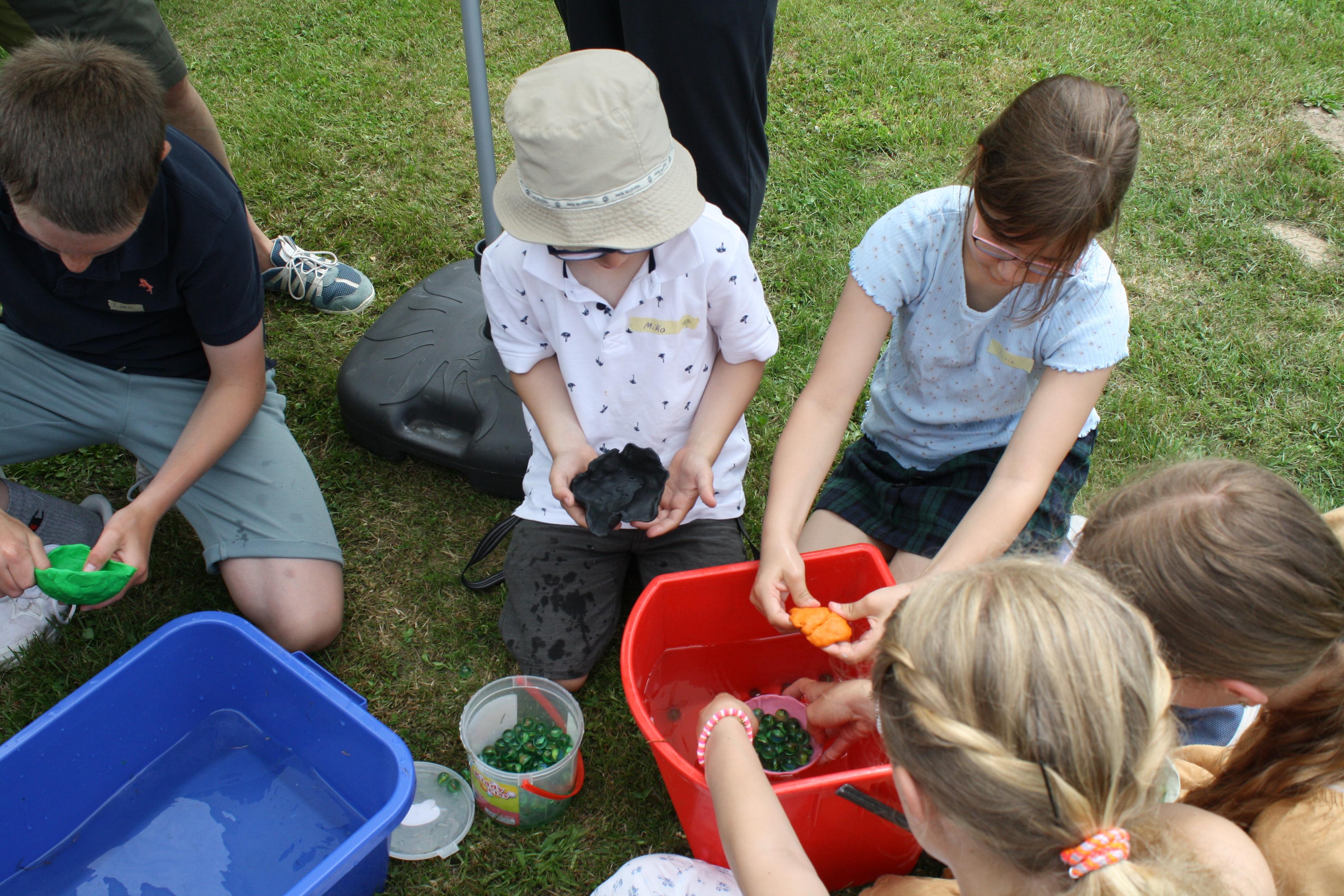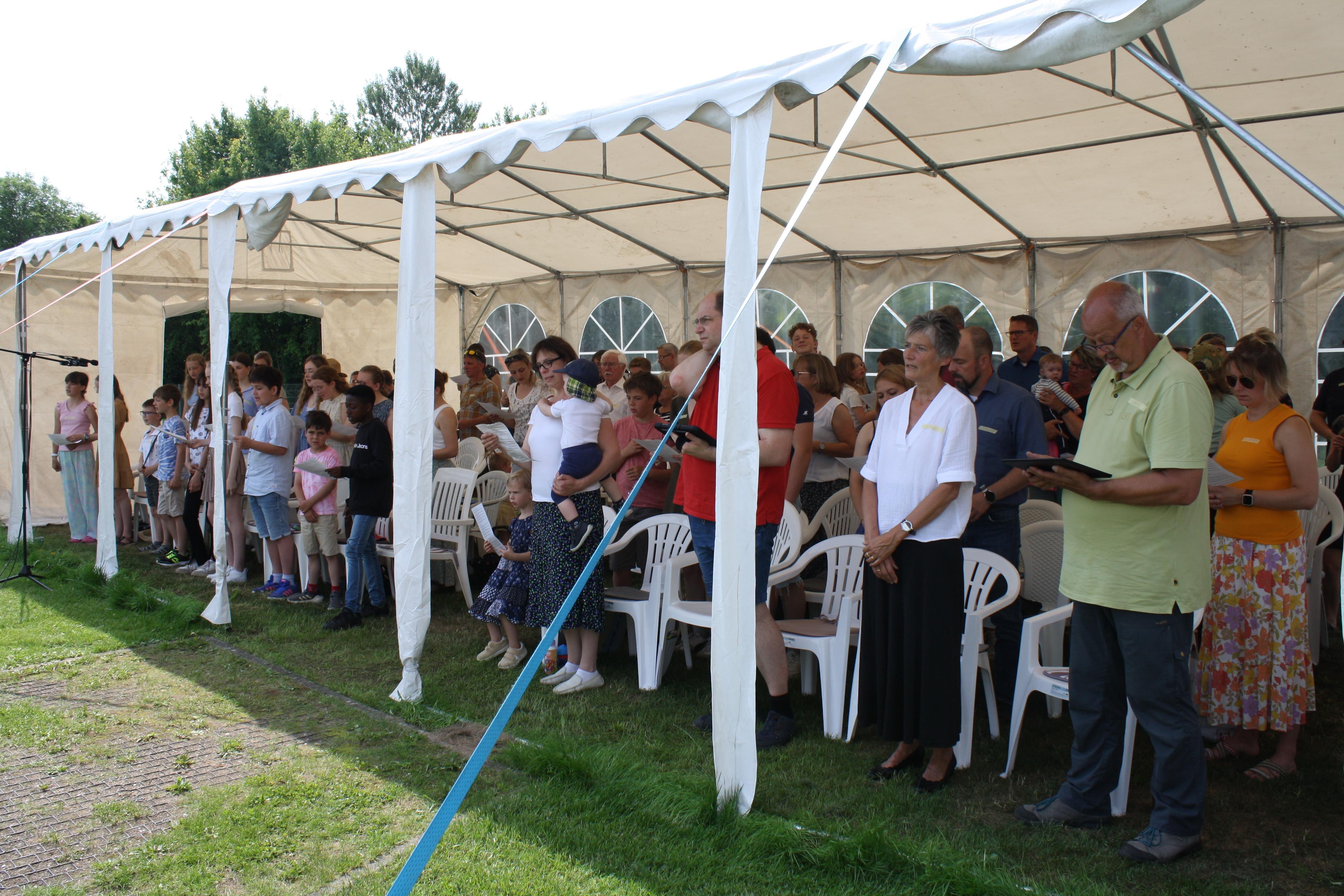 Nach dem Gottesdienst gab es zur Stärkung Hotdogs zum Mittagessen. Anschließend konnten sich die Kinder an vielen verschiedenen Mitmachstationen austoben und kreativ sein. Egal ob beim Stangenklettern, Fußball spielen, basteln eines Naturwebrahmen, Töpfe bepflanzen, Steine dekorieren, Erbsen schätzen, Kinderschminken und Seifenblasen machen. Und ein spannendes Murmel-Experiment: Ein Knetboot sollte mit so vielen Murmeln wie möglich beladen werden, ohne unterzugehen.