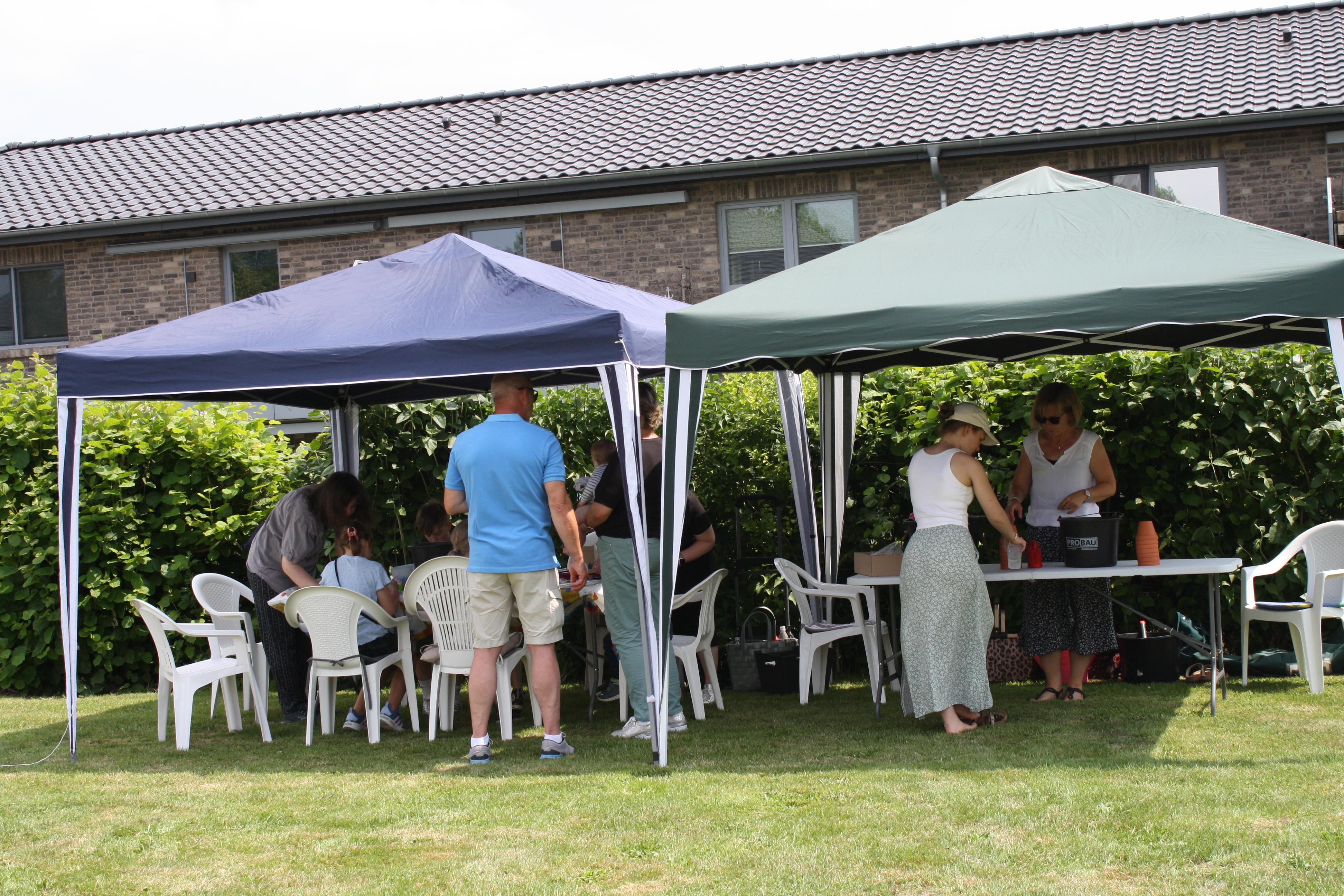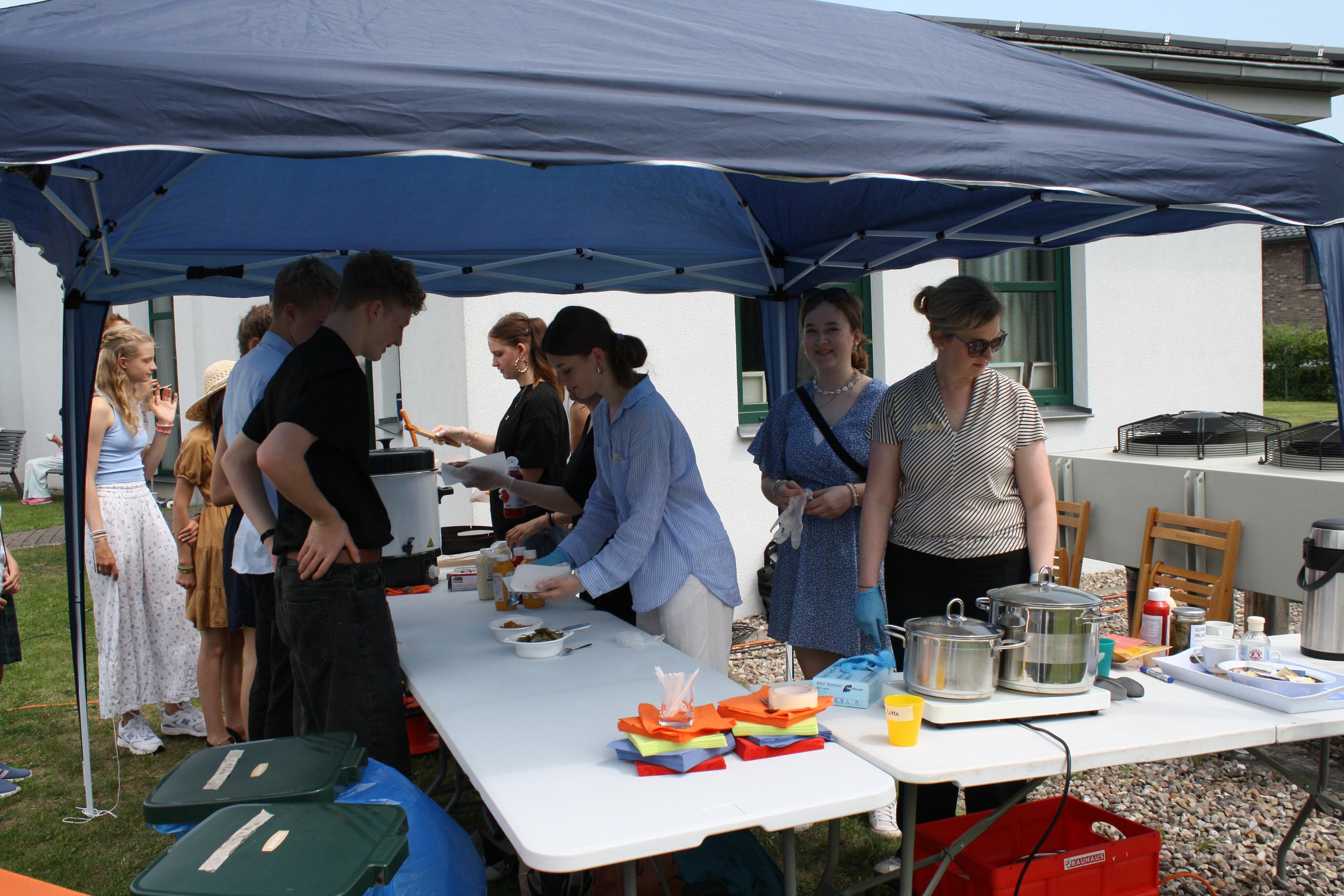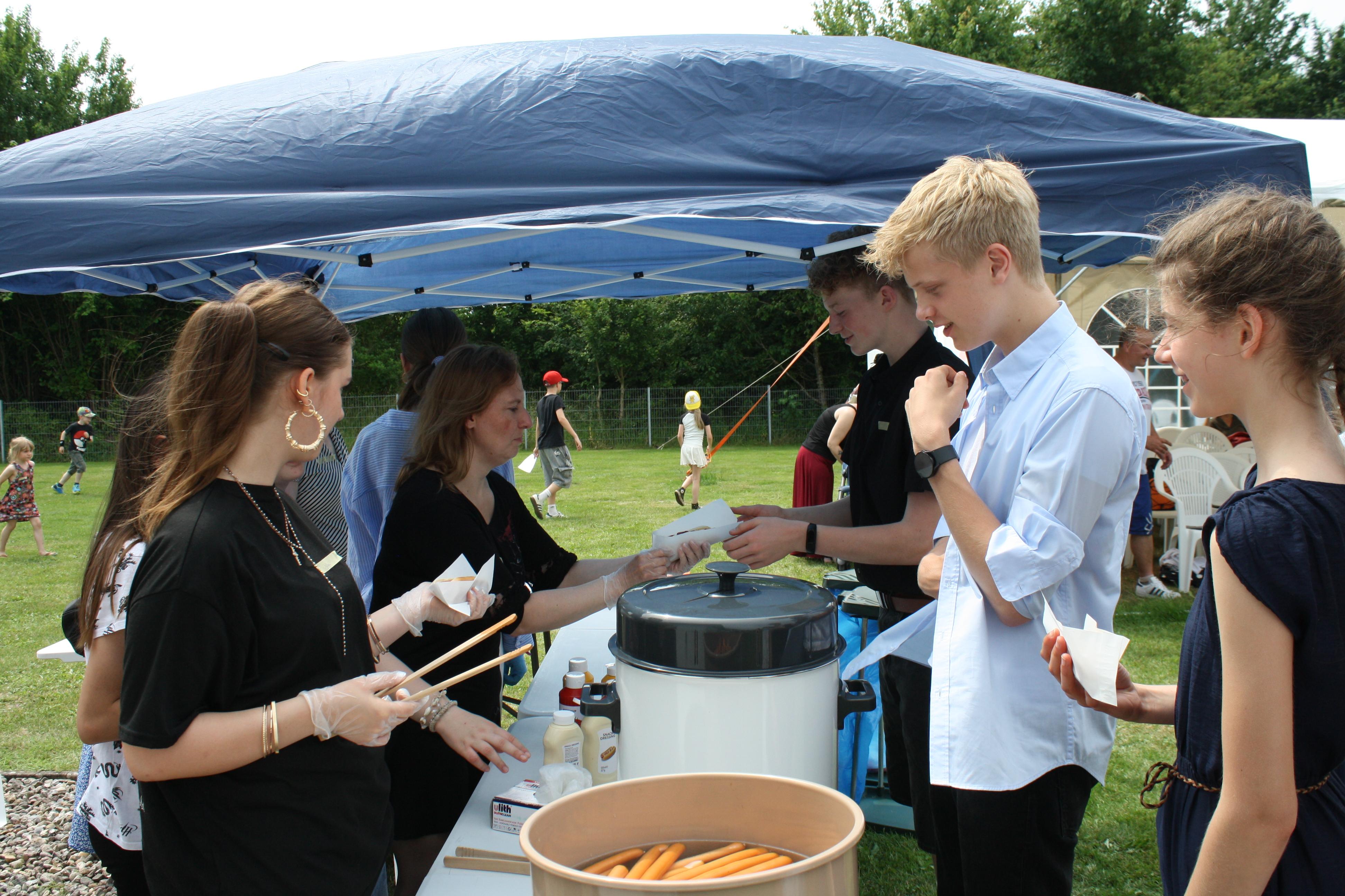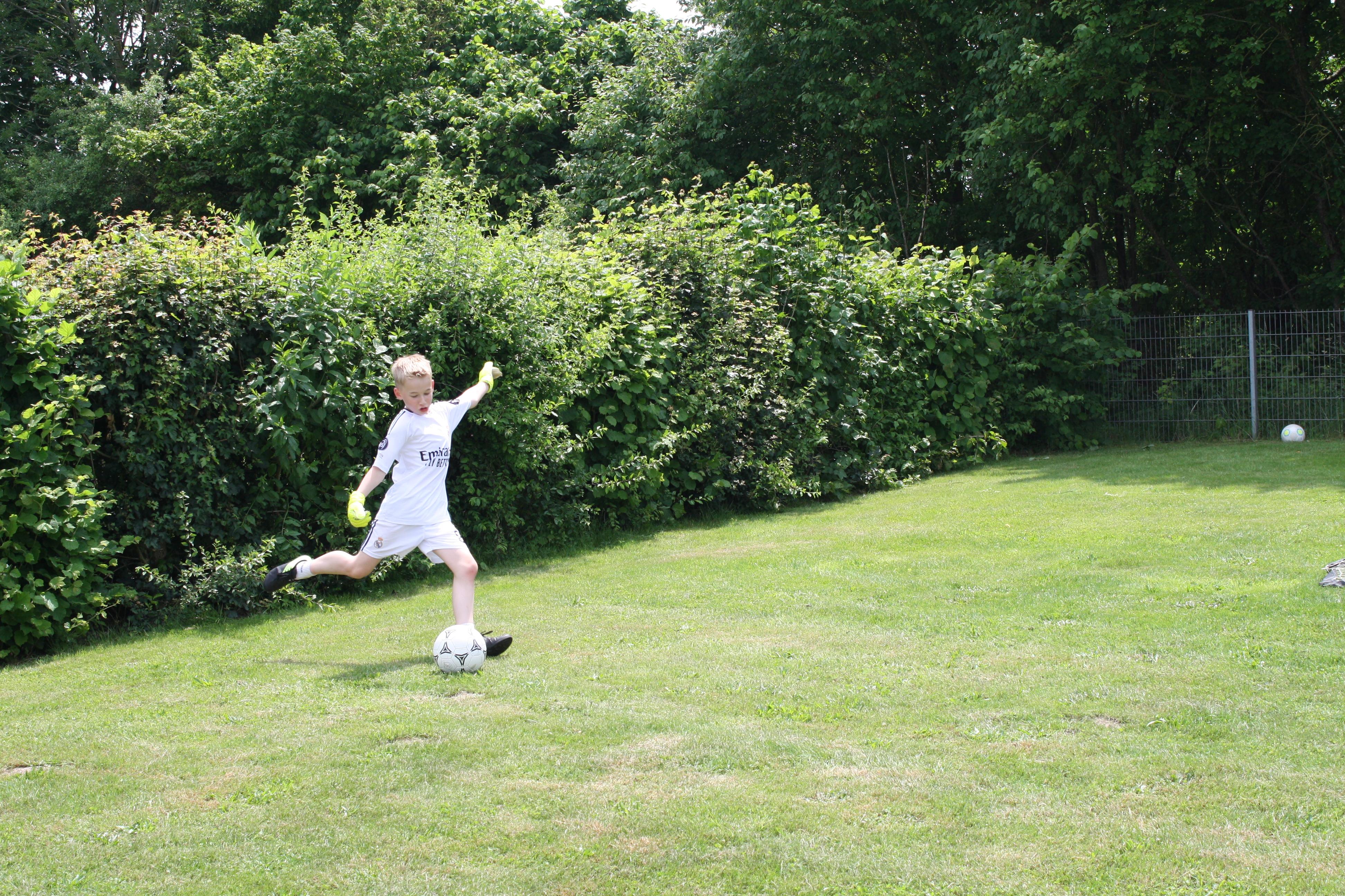 Nach dem Gottesdienst gab es zur Stärkung Hotdogs zum Mittagessen. Anschließend konnten sich die Kinder an vielen verschiedenen Mitmachstationen austoben und kreativ sein. Egal ob beim Stangenklettern, Fußball spielen, basteln eines Naturwebrahmen, Töpfe bepflanzen, Steine dekorieren, Erbsen schätzen, Kinderschminken und Seifenblasen machen. Und ein spannendes Murmel-Experiment: Ein Knetboot sollte mit so vielen Murmeln wie möglich beladen werden, ohne unterzugehen.